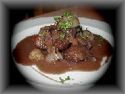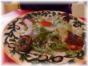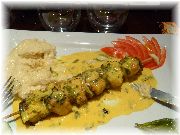 | ニースの旧市街地でフラッと入ったビストロ。薄暗くて店の雰囲気は良い感じ。 | 牛肉の串刺し、こちらではブロケットといいます。 | ごく普通のりんごのタルト。味に力強さが無く、うちのタルトのほうがおいしい。 | 店構えはちょっと賑やかな感じでしたが、ここはうまかった!お勧めのお店。ここもニースの旧市街地。 |