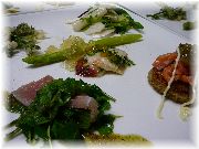 | ホワイトアスパラのムース | スズキのシェリー酒ソースとホタテのソテーケイパのソース | キウイのヨーグルトクリーム、蕎麦のアイスクリーム、ラムキャラメルケーキ他 | |