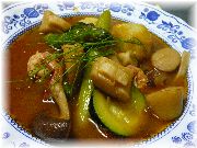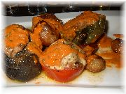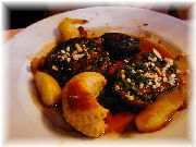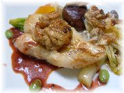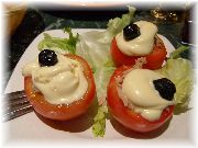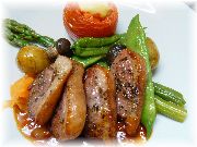 | フロマージュブランにキャラメリゼしたフルーツと、キャラメルソースがかかっているデセール。シンプルだが何か嬉しい一品です。 | コック・オー・ヴァン(鳥の赤ワイン煮)です。プロヴァンス郷土料理ではありませんが、フランスを代表する料理。びすとろまほうの家でも時々お出ししています。 | フォアグラのサラダです。サラダといってもメイン料理なんです。ボリュームたっぷりで、これを食べている人が多かったので試してみました。 | トマトのファルシー。ファルシーはプロヴァンスの伝統的郷土料理です。 |