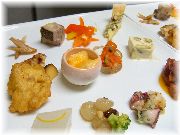 | トマトのムース | 田舎風テリーヌ | 魚介のハーブサラダ | 旬の野菜の付け合せ |