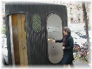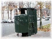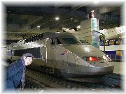 | 古い公衆便所。このタイプはここにだけありました。おそるおそる中を覗いたら・・・、想像通りでした。 | 街で目にするのはこのタイプです。硬貨を入れて15分間くらいで用を済ませて外に出ないと、部屋の中が洗浄モードになり、全身水浸しになってしまうそうです。パリはトイレが少なく、駅でも有料です。寒い日はつらい。 | 残念ながら改装工事中で閉館していたカタコンブ。うーん、とてもがっかり。それにしてもがい骨の並べ替えでもやっているのでしょうか? | ご存知フランスの新幹線TGV。ここはモンパルナス駅のホームです。今度はこれでプロヴァンスまで行ってブイヤーベースを食べるぞ。 |