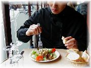 | ビストロ・レ・ボンビスの店内。とても洗練されていて、気に入りました。ギャルソンの対応が非常によい!居心地もよく、最もパリっぽいおしゃれな店でした。 | 夕方にふらっと入ったサロン・ド・テ。コーヒーを飲むところがカフェなら、お茶を飲むところがここ。ヘルシー思考か、最近増えているらしいです。 | ヴェルサイユ宮殿に行く途中でお昼に入ったレストラン。絶対にお勧めしたくない、店の名前も憶えていません。 | 左のシェフは、街の中の公園の横にひっそりとたたずむオーベルジュ・エチェゴリーのオーナーのアンリさんです。初めての客なのに、色々と声を掛けてくれ非常に親切でした。最後にニコッとして、食後酒をサービスしてくれました。感激でした!是非また行きたい店です。 |