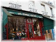 | 静かな通りにあるレ・ボンビス。 | 昼、夜はこのスペースは人でびっしりになります。外気温は一桁なのに外のテーブルは当たり前のようです。 | 歩きつかれてふらっと入ったサロン・ド・テ(お茶専用の喫茶店)。 | バゲットを買うためよく通ったパン屋。お菓子も充実。 |