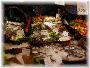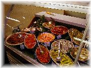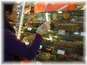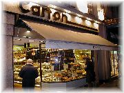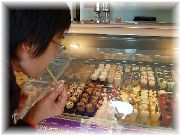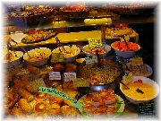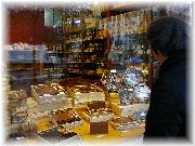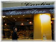| おいしそうな惣菜コーナーもあります。 | ウインドー越しに色々なチョコレートを眺めるオーナー夫人。「買う?」 | お菓子屋はたくさんありますが、すべてうまいとは限りません。 | サンジェルマンデプレでは夜もマルシェが出ます。活気あるなあ。 |