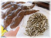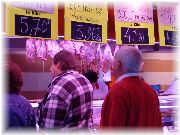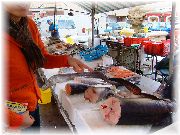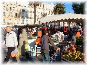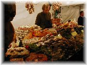 | ニースのマルシェ。さすが南仏だけあって海産物のお店が目立ちます。大きな塊でダイナミックに売られており、「こんなに売れるのかな」と思っていたら割りとすぐに無くなっていました。 | 舌平目や小魚など種類も豊富。そして安い。ここで仕入れて料理するのも楽しそう。 | 午前の早くからすごい行列が出来ており、何だと思ったら肉屋でした。非常に活気があり、商品は飛ぶように売れておりました。 | 11月だというのにたくさんの野菜が売られておりました。信州では冬ごもりなのに、ここは収穫真っ最中でした。うーん、変わった野菜があるなあ。 |