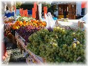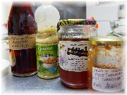 | 雨が少なく強い日差しで育ったブドウが山積みです。何とこれがあっという間に売れてしまうのです。恐るべしフランス人の胃袋。 | フランスの街中には随所に広場がありますが、こうやって定期的にマルシェを出すにはうってつけです。びすとろまほうの家で皆さんにお出しするため、大量のプロヴァンスハーブを買ってまいりました。周りのおばさん達がビックリしていました。 | これらもマルシェで買いました。左からイチジクのお酒、ドレッシング、ハーブの蜂蜜、アプリコットのジャムです。特に蜂蜜は印象的でした。ビンを傾けてもたれない。非常に濃厚な代物です。もちろんセ・ボン! | |