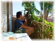| テラスからは旧市街地がずっと見渡せ、さらにその先は地中海です。くーっ、たまらん。 | 地中海性気候なので昼間の日差しはまぶしい!でも空気は乾燥して気持ち良い。 | 食事はこの場所で摂る事が多かったです。 | 朝食は近くのブーランジェリーで買ったバゲットなどを、美味いバターやチーズとともにここで食べます。朝からロゼも飲みます。 |