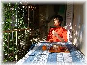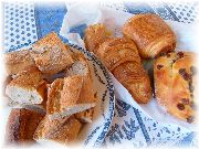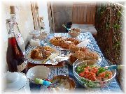 | フランスはどこでもおいしいパン屋さんがあり、とても助かります。当然ですが店によりスタイル、味が違うので好みのパン屋を見つけるのがまず重要です。 | 近くのお店やマルシェで買った食材で朝食を食べます。あれ?朝からロゼですか? | アパートのテラスから見た黄昏。プロヴァンスの1日は今日も暮れていく・・・。 | アパートの大家さんです。とても親切で、茶目っ気たっぷりで、真面目な方です。夕食に招待されました。こういうのってとても嬉しいですね! |