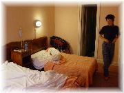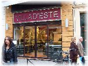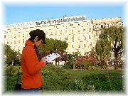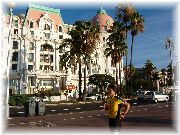| 朝に海岸線をひたすら走っていましたら、日時計がありました。私の影が時刻を刻んでいます。 | あっ、ヴィラデストだ。玉村豊男さんの工房と同じ名前です。ここはイタリアンのカジュアルなレストランでした。 | ニースで滞在したホテル。ベッドが大きすぎ。特に手前のベッドは4人ぐらい寝られる。街中ですので空気が悪く、息苦しかった。夜にニースに着きましたので、じっくりとホテルを選ぶゆとりがなかった。まあいいか。 | 夜ホテルの窓から撮りました。向かいのビルも1Fはお店で、2F以上は住居のようです。我々の真向かいのお部屋のおじさんとはよく目が合いました(笑)。 |