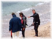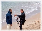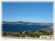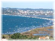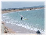 | 半島の先端からヨーロッパ大陸を眺めた風景で、見える海はもちろん地中海です。海の向こう岸が我々が滞在しているイエールの町です。 | 弓のように長く伸びた美しい海岸線です。遠くて解りませんが、現在このビーチには100人以上のボードセイラーとカイトサーファーが、平日にもかかわらずミストラル(地中海に吹く強い風)と遊んでおりました。 | 地中海ですので波は穏やかで、風が強くても比較的容易にビーチスタート可能なんです。太平洋を相手に練習していた私達日本人にはちょっと変わった光景でした。 | 平日なのに風が吹くとたくさんのセイラー(サーファー)がビーチにやってきます。でも驚くことには、ほとんどが年配者!ここが日本とは大きく異なる点です。このおじさんも海から上がるなり非常に興奮した様子で友人にこの日のコンディション、あるいはライディングについて熱弁していました。 |