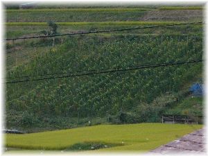 窓から畑に目を落とすと南斜面にワイン用のブドウが見られます。これはカベルネフランという品種で、近所の若い青年が育てています。