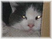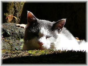 | ようやくリラックスした表情を見ることが出来るようになりました。白と濃いグレーのツートンカラーのネコです。見かけたら決して追いかけないでね。そっとしておいて下さいね。これは2007年の秋。眠っている隙にやっとの思いで撮影に成功。カメラを向けるとまず逃げますから。野良の血はかなり濃かったです。と言うより、完全に野生でした。でもとっても可愛かった・・・。 |