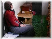 | 玄関の土間スペース。かごの中で寝ていますが、人の気配がすると顔だけ向けてちょっと警戒しています。 | 我々だとわかると安心したようにゆったりしているようです。この場所では大きな声を出さないで下さいね。お願い致します。 |
