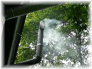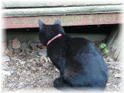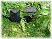 | 雨の日だろうが五右衛門風呂は毎日焚きます。火を使うと家がカラっととなるから好きです。 | 五右衛門風呂の焚口でずっと見ていたぷまは、私が庭に出ると一緒についてきます。 | あれ、どこに行くの? | サークル花壇に入り、周りの様子を伺っています。 |