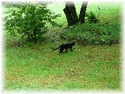 | 名前の通り、ボクは穴を掘るのが得意です。一見タヌキみたいです。人懐っこい、愛嬌のある動物です。見かけたらいじめないでね。 | プマちゃんが縄張りを主張しています。ニホンアナグマはネコ目イタチ科なので、お友達でしょ!仲良くしなさい。 | はーい、わかりました。あれ?いなくなってしまったよ。どこかなあ。 | あっ、こんなとこにいた!初めて見る動物に、興味津々のプマでした。 |