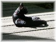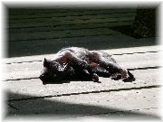 | 何故かマフラーをして、気取って出てきたぷま。 | デッキの上でひなたぼっこ。 | 背中がかゆいのか、体をくねらせています。 | と思ったら、寝てしまいました。 |