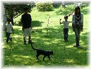 | 物陰に隠れ、獲物を狙うぷま。 | 少しずつ前進・・・。 | 逃がしたかー。悔しそうに仁王立ち。 | お客様と一緒に遊ぶぷま。まだまだ子猫です。 |