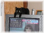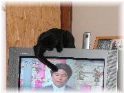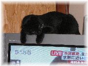 | プライベートの部屋にて。カーテンに隠れ、そっと様子を伺うぷま。 | テレビの画面の人間に興味を持っている最中のぷま。 | この人だれー?と我々に問いかけます。 | 知らないおじさんにもこうして「ネコパンチ」。 |