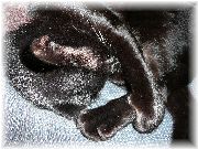 | 散歩には大抵ついて来ます。遊歩道の真ん中で一休み中です。 | 面白いショットです。自分の足を手でギュッと掴んで寝ています。ドラえもんみたいな手でしょ。猫が物を握るのを見るのがとても好きです。たまに私の指も握りますよ! |