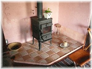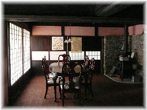天井は柿渋、壁は漆喰の落ち着いた空間。鉄平石を積んだ炉台の大きな薪ストーブが唯一の暖房機具。板戸と障子を閉めた状態です。引き戸はかなり便利で、部屋の雰囲気をまるでトリックのように変えてくれます。 |