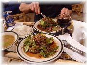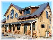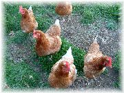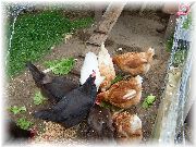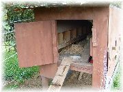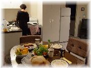 | ここにもたくさんのニワトリがいました。それに大きなウサギも同居しています。冬はマイナス5度くらいにはなるそうです。 | ご主人作のニワトリ小屋。外側から容易に卵が取り出せるような、構造になっていました。これは使える! | キッチン周り。非常に綺麗で清潔でした。設備類もまだ新しい。夕食の準備をする夫人。 | ダイニング兼リビングです。今日の夕食が並びました。 |