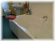| とにかくバスが大きかった!びすとろまほうの家のと雲泥の差。私達と同じくオープンしてあまり日時は経っていないらしいです。 | 二番目の滞在地はニュープリモスという割と都会でしたので、B&Bではなく、モーターホテルにしました。繁華街からちょっと離れていましたので、割と静かでした。 | 部屋の中は無垢板貼り。山小屋風で、とても清潔で快適な宿でした。ニュージーランドはあらかじめ宿を予約するより、そこに行って、実物を見てから決めた方が面白いし、確実。 | 角のお部屋でしたので、裏庭にすぐに出ることができました。夕暮れにはぼーっとワインを飲みながら、明日の予定を考えたり、物思いに耽ります。 |