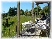 | テラスで遊ぶ夫人。午前はタラナキ山をトレッキングしました。 | こちらの建物はここのコテージのオーナーの個人宅です。こじんまりしていて、庭も手入れが行き届いている素敵な家です。夢の空間ですね。 | オーナーの愛車スバルのインプレッサが大事に駐車されているガレージ。オーナーは若い頃はロンドンでエンジニアをしていたとのこと。私達と同じ様なライフスタイルに親しみを覚えました。 | 田舎に住んでB&Bを経営されている方の多くは、イギリスやニュージーランドの都会の方からIターンをしてきたようです。 |