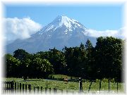 | ここに1ヶ月くらいは滞在したい気がしました。周りの空気が違います。音が違います。匂いが違います。 | リビングから外を見たところ。なんと窓の下に野うさぎがいました。出来すぎ。 | 私達の頼もしい相棒のレンタカー。駐車場もこのようにオープンでいいでしょ。 | 庭からはラストサムライのロケ地であるタラナキ山が見えます。 |