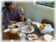 | B&Bですので朝食のための材料は冷蔵庫などに豊富に入っており、自由に使ってよいのです(つまり自分たちで作らなくてはならない)。卵はもちろん自家製、パンは希望の種類を焼いて持って来てくれます。 | レンジ、オーブンは全て電気。これがとてもパワーがあります。 | この季節は朝は少し冷え込みます(15度くらい)。車山の6月頃でしょう。 | 今や日本のスーパーに並ぶ野菜はNZ産が非常に多くなっています。道を走っていても見えるもの全てが牧場なのに、一体どこで作っているんだろう? |
