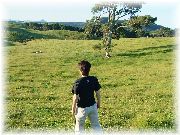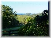 | コテージの裏側もきれいに芝が刈り込まれていて、とても快適な空間でした。ファームステイという宿の名前ですが、牛の世話をしたりするわけではなく、全く自由です。 | コテージのテラス。テラスの周りには色々な植物が植えられておりました。ここから海が見えます。 | 地平線の向こうに海が見えます。かなり北に来ましたので、さすがに暑い。ウエットスーツ無しで海に入れそうです。 | 若いオーナーでしたが、何と所有する牧場の広さは200ヘクタールとのことでした。かなり歩かないと境界まで行けません。 |