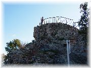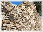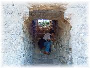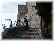 | 狭い遊歩道が迷路のように張り巡らされており、フランス人の意外な緻密さが感じられます。 | 積んだだけの石。シャトーの壁を構成しています。荒っぽいですが、雄大さが感じられる、独特な雰囲気がありました。 | どこの国もお城は見晴らしの良いこんなところに建てますね。左のは、崩れかかった城壁です。たぶん、ですが、今にも崩れそうな城壁ですが、近くで見てみるとちゃんと補強され、この状態を維持しているようでした。 | 物見やぐらに立つカミさん。 |