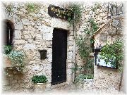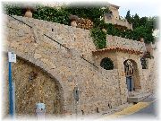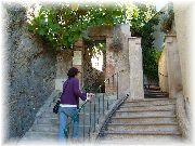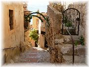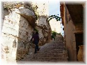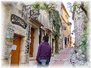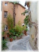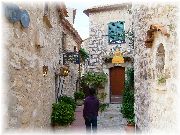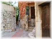 | 南仏の石積みと言えばまずエズ村が日本では有名です。私達が行っているときも多くの日本人の団体の方とすれ違いました。ニースからバスで15分くらいで行けます。 | いわゆる「鷲の巣村」と呼ばれる、海に面した絶壁に村を作っています。岩場の地形をうまく利用し、住居やギャラリー、ホテル、レストランがひっそりとあります。 | 階段が多く通路が狭くて、ちょっと迷路のようで歩くだけでも結構楽しいものです。 | どこまでが公道でどこからが私道なのか、考えるだけ無駄かな? |