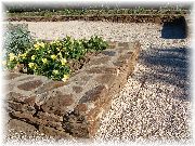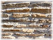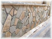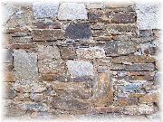 | 色々な色の石を組み合わせている壁です。人工的に作られたブロックやタイルを貼り付けるより、こういった自然のままの材料を使うことは、現代では非常に贅沢なことですね。 | 使う石の種類のみならず、施工する人(職人さん)によっても出来上がった作品はこんなにも様々な表情をかもし出します。面白いことです。 | 薄く平べったい石を積み、側面を表に出した壁です。 | 更にその壁を太陽に当たる時に見ると凹凸が影をつくり、日陰で見た左の壁とはまた違って見えるのがまた面白い。 |