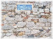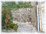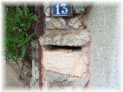| 「シャトー通り」という標識が貼ってあるこの壁は非常に古そうで威厳がありました。何だか割れた植木鉢のかけらみたいなものも一緒に壁の材料として、モルタルで固め積まれていた様でした。 | 画像が小さくてわかりづらいですが、石で作られた階段状小道が左に緩やかにカーブしていて、「この先はどんな感じなのかな?」とワクワクさせるような通りでした。 | シャトーから見下ろした時に見つけた高級住宅街の、ある住宅の玄関周り。やはりしっかりとした石積みの壁が印象的でした。木造の塀や門はほとんど見当たりません。どこもかしこも石、石、石・・・。 | なんとご家庭の郵便ポストまで石で作られておりました。 |