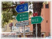 | ジアン半島の付け根にあった公園の花壇にも石積みが。 | 木材よりも圧倒的に石が多い、つまり大工さんより左官屋さんのほうが多い(?)南仏の旅です。 | ニースの旧市街地をシャトーのてっぺんから眺めた景色です。シャトー周辺は非常に手入れが行き届いていて、多くの観光客がいます。11月でしたが、この海岸で白人の年配の方が何人か泳いでいました。 | ここはエズ村。右に行くとニース、左がモナコの標識。 |