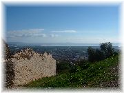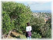 | シャトーから隣の丘の高級住宅街を眺める。年配のお金持ちがヨーロッパ各地から移住して、土地が急激に上がっているそうです。この住宅街を調査すべく(?)、ジョギングしながら見てきました。 | イエールの丘にそびえるシャトーを探索中。砲台等の効率的な攻撃のための作りをまじまじと見ました。 | シャトーのふもとにはオリーブが茂っています。イエールの街とその向こうにあるジアン半島、さらには地中海が見えます。 | 古い崩れかかった石積みの建物がありましたが、さすがに危険なため「近寄らないで!」の看板がありました。 |