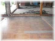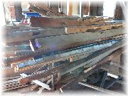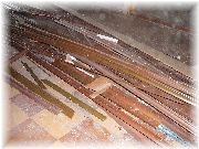 | 前回残ってしまった分です。早速これらの釘を抜きます。中にはひどく錆び付いて抜けずに頭だけ取れてしまうものもあります。 | 2Fの電気配線を外したもの。古いケーブルは曲げるとポキポキ折れてしまうものもありました。これらもリサイクル業者に渡します。もう一度生まれ変わるんだよ。 | 半日ほどでようやく釘抜き作業が終了しました。ご覧のとおり解体材は無くなりました。FERMEは少しずつ、少しずつ作業は続き、日進月歩で完成に近づいています。 | 本日の後半は2Fの梁の埃落とし(煤払い)をやってみました。相当な数がありますので何日か、かかりそうです。2Fは天井材が貼っていなくて屋根天井になっております。従いましてかなりの高さがありますので、高所作業用タワーを組み立て、柄の長いホウキでまずは埃や煤を落とします。 |