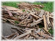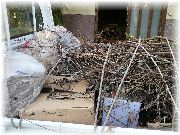 | 今年最後の草刈です。これから約半年は草が伸びません。 | 庭も以前と比べると綺麗になりました。でも良く見るとまだゴミが・・・。 | 部屋に立てかけてあった畳を全て車庫に移しました。これは残念ながら再使用しません。ストロウベイルハウスを将来これで作ってみようかな!? | 今日も多くの廃材が。これらは不燃なのでお風呂には使えません。やはり自然に帰る素材で家を作りたいです。 |