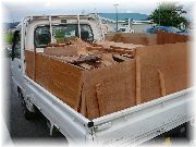 | さあ、今日もひたすら釘を抜くぞー。時間はありそうで結構無いのですね。人生長いようで短いのですね。マイペースでどんどん作業します。するとこんなにも残りが減りました。よーし!と、一人で無理やり意気込んでます。自分で自分を盛り上げないと、単調でつらい作業・・・。 | やったー!とうとう終わった。綺麗に無くなりました。嬉しいのでホウキでちょっと掃いちゃいました。この床もやがては剥がして、本当に昔の状態の土間にする予定です。時代を100年戻すぞ! | 昨日と本日の2日間で釘を抜いて薪として使える状態になった材です。君達、市の焼却炉で重油で処分されるのではなく、高原の宿のお湯を沸かして世の為に働くのだ。いいか! | 軽トラに満載。重いよー。さあ、びすとろまほうの家に行くよ。 |