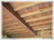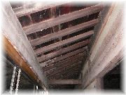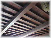 | 北側の部屋の天井材は他と異なり石膏ボードでした。石膏ボードを剥がすとさらにご覧のようにベニヤが貼られていました。こんな時はテレビ番組の「ビフォーアフター」で見るように、いっぺんにバリバリと派手に剥がすんだろうなと思いつつ、1枚ずつ丁寧に剥がすのでした。 | 柱に横に向けてかかる梁も、こんなふうにベニヤとビニルクロスで隠されてしまっています。もちろんこれらも全て取り除きます。この画像は真っ白ですが、剥がすと真っ黒に変わります。 | 石膏ボードとベニヤを剥がすとこんな状態でした。真っ黒に煤けた天井板と根太に何十年ぶりかで光があたっています。後から貼った天井材と元の天井との間が結構スペースがあったため、小動物の住処になっていたらしく、ゴミや埃がすごかったです。 | 天井下地も剥がすとこんな風になりました。うーん、昔っぽい!いいぞ。この飾り気のないシンプルでいて、かつ力強い表情は飽きが来ないね。化粧材など無駄なものは無し。 |