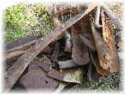 | 敷地内には長年かけて捨てられたゴミがまだまだあります。このように一箇所にいろんな物をまとめて捨ててあります。この中には子供用自転車、車の座席、草刈機、たくさんの鍋、雨どい、網、鉄の菓子箱、水筒など・・・。 | 1日作業でご覧のとおり、この箇所のゴミはすべて処分致しました。スッキリして気持ちいい!金属類は業者が喜んで持って行ってくれました。この作業を敷地内の全てでする必要があります。 | 何と車の座席が捨ててあったのですが、周りの布や中のクッション材を手でひきちぎり、金属部分だけにして業者に渡しました。1日1日と段々と変化してゆくFERMEを見ているとウキウキと楽しくなってきますね! | 本日出た金属類のゴミ。これの他に錆びたトタンが10枚以上と、室内電気配線ケーブル(芯が銅なので)家1軒分。 |