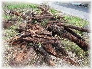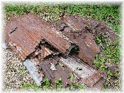 | 以前畑として使われていたと思われるところに、ご覧のようなトタンが積み重なっております。物をゴミとしてなるべく捨てたくない私でも流石にこれは使い道がありません。錆びたトタンを無機質な部屋のインテリアにしている例を見たことはありますが・・・。鉄くずとして業者に引き取って頂き、リサイクルされることを望みます。 | 錆びたトタンを剥がすとそこには太い木材が積まれていました。もちろんほとんど腐っていますので使えません。天日干しして乾かして、使える部分は薪にします。使えない部分は土に戻します。木材はここだけでも20本くらいあります。土と草でほとんど埋まってしまっています。 | 土の中に埋まっているトタンは錆びすぎてボロボロ。つかむと崩れます。小さいのもこまめに取って、敷地を自然なままのきれいな状態に戻します。 | トタンの下から出てきた木材。しばらくはこの場所で乾かします。もう何十年太陽光を浴びていないんだろうなあ。気のせいか、何となく嬉しそう? |