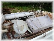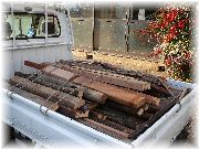 | 庭のあちらこちらに色んな物が捨ててあります。年月が経っていますので、草や土に埋まってしまっています。それらを掘り出し、すべてきれいな状態にするのですが、まだ先は遠い。とりあえず今回は、鉄くずを引き取ってくれる業者がありますので、鉄のみを集めます。 | 今日も残念ながら時間がありませんので、休憩無しの急ピッチ作業です。東側の庭からは車のシートが出てきました。すごいでしょ! | 雨どいの様なかさばるものは踏ん付けて小さくたたみ、軽トラに片っ端から積み込みます。勿論今日だけでは終わりませんので、なるべく大きな物に絞って積み込みます。鉄くずといっても古いので錆だらけです。こんなの引き取ってくれるのかなあ? | 帰ろうとしたら何と窓の外にアマガエルがちょこんと座っていました。夕日を浴びて何だか黄昏(たそがれ)ています。いじめないので、我々を受け入れてね!よろしくね! |
