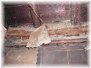 | 南側の縁側の天井部分は、天井材、その下地全て取り除きました。すると年季の入った古いが、逞しい木材がその姿を現しました。うーん、力強い。 | 鴨居部分も後から色々と細工をして一見見栄え良くしているようなのですが、これも全て取り除きもとの姿に戻しました。 | 100年前は部屋の明かりのスイッチまで用意されていなかったのでしょう。後から土壁に穴を開けて、無理やり電気設備を埋め込んでいました。スイッチ部分を取り除いた後の姿。痛々しい。 | 今日も解体した部材がたくさん出ました。そろそろ片付けないと、いたずらで火でも点けられたら大変です。何せ今は空き家なのですから。 |