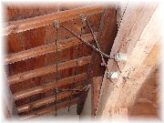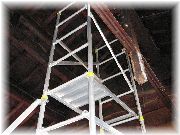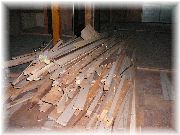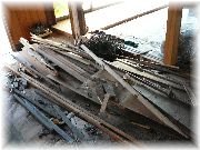 | 2Fの解体した木材の山です。比較的太目の釘が刺さっています。これらをお風呂の燃料にするので、釘を全て取り除きます。こんなことプロの解体屋さんは絶対にやりません。 | 今日は1日かかってこれだけの解体材から釘を抜くことが出来ました。まだ少し残ってしまっています。後日やります。 | 同じ作業をずっとやっていますと腰痛の原因になります。なのでたまには違う作業で、異なる筋肉を使わなければなりません。高所作業用タワーを組み立てて高いところに打ち付けられた釘などの撤去を行いました。 | さらにタワーを使って棟木に縛ってあったワラ縄を外したのがこれ。何のためにこのワラ縄が巻きつけられていたのだろうか?外しちゃって良かったのかな? |