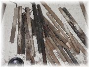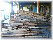 | 玄関、縁側、作り付けタンスなどの解体により出た木材。この状態では釘がたくさん刺さっています。積み上げられた木材の高さはみぞおちほど。 | かなづちと釘抜きのみで作業します。解体材は薪ボイラーや五右衛門風呂で燃やすので、釘はあらかじめ抜きます。抜いた釘は鉄として再利用されます。 | 本日釘抜きを終了した解体材。角材と板材それから小さい木っ端に大体分けて、運びます。今日はお客様のチェックアウト後の半日作業でした。 | 今日も休憩無しで集中して作業しましたが、これだけしか減りませんでした。もっとピッチを上げなければ。なるべく時間を作り、徹底的に作業することにします。 |