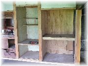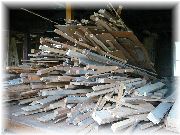 | 草刈作業の後、今日の解体は作り付けタンスの左側です。前回に扉と横の壁は取り除きました。正面から見るとこんな感じ。タンスの上のほうは白っぽいベニヤでカバーされています。これも取り除きます。 | タンスを裏から見ますとこんな感じです。初めはこのタンスの後ろに敷居があって障子が閉められていて、後ろから見るとタンスがあるとは思えませんでした。でも色々なものが剥がされ、段々とこの家の正体が解ってきます。それってなんだか人間みたい。 | 全て取り除いた後の状態です。大黒柱と階段しかありません。もともとはこの表情の家だったのです。 | 梅雨でなかなか木材を運べません。こんなにたまってしまいました。捨てずに木質系燃料としてびすとろまほうの家で使いますので濡らしたくないからです。お天気の良い日にまとめて運びます。 |